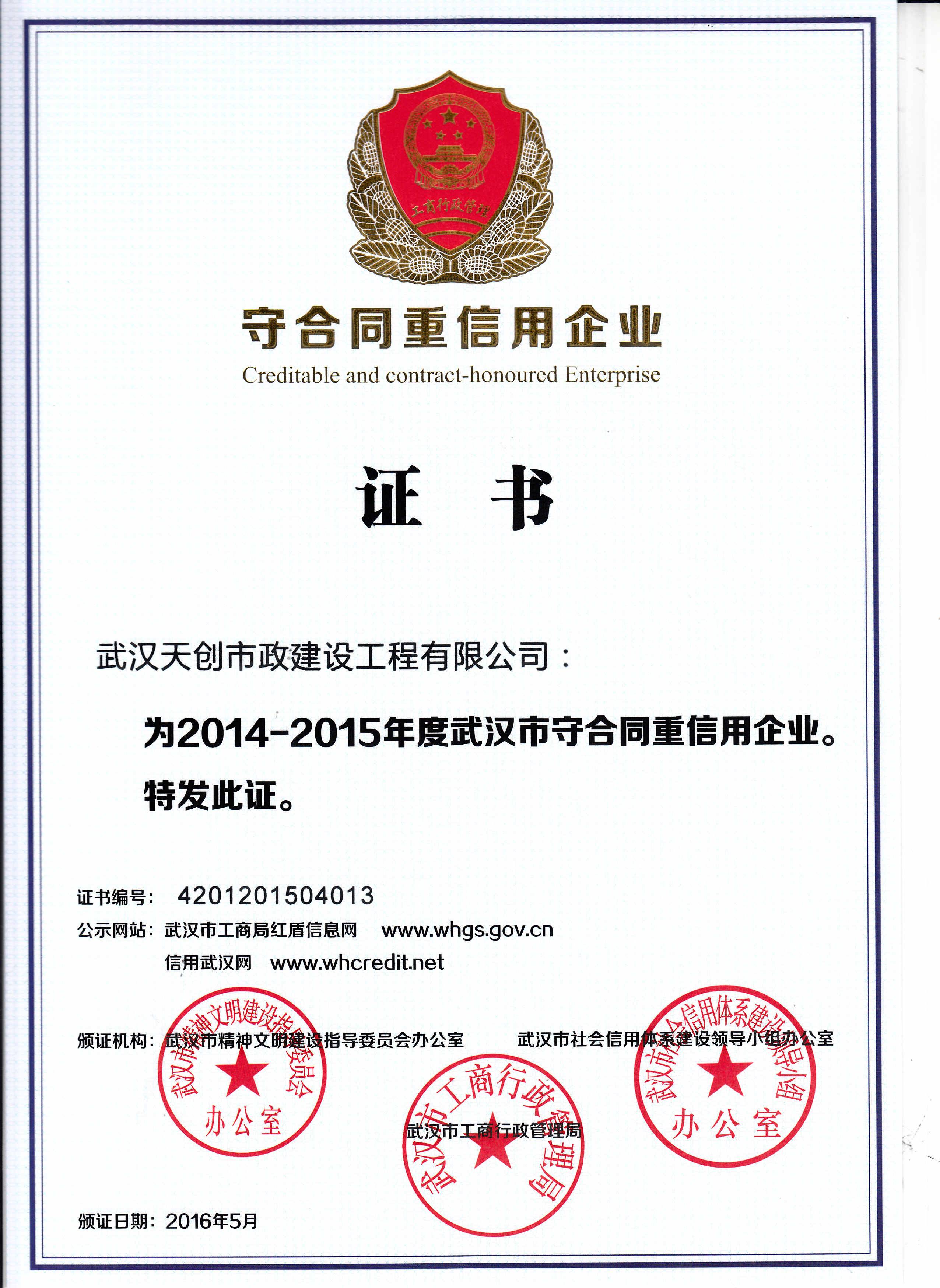 2014-2015年度湖北省市政行业AAAA级诚信企业