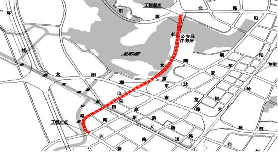 该工程位于武汉市二环、三环之间,全长约3026.226米,含有两座跨龙阳湖高架,康达街至朱家新港路段为“高架+地面辅道”形式,其他路段为地面道路形式。汉阳市政天创公司负责实施的部分包括全长485.5米、以高架形式跨越龙阳湖的1号桥、Y/Z匝道以及长约185米的地面道路施工。