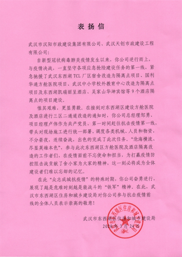 3月24日、3月25日,汉阳市政天创公司收到了来自武汉市东西湖区住房和城乡建设的表扬信和来自武汉临空港经济技术开发区城市建设发展投资集团有限公司的感谢信,信中对汉阳市政天创公司参与防疫建设工程的全体人员表示崇高的敬意!