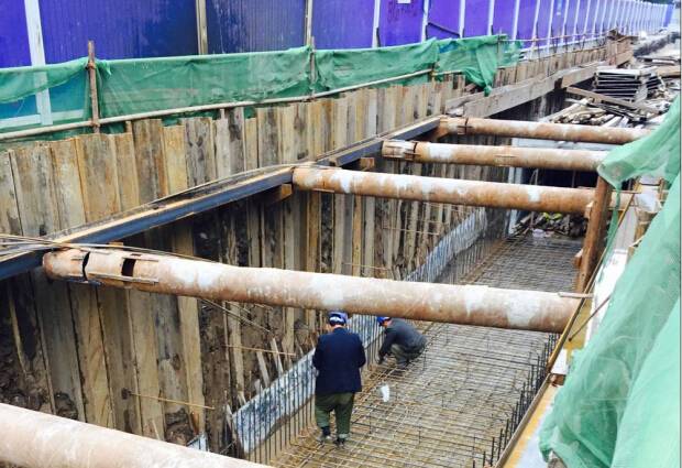 3月,宝丰路硚口路快速化改造工程项目部搭建形成宝丰一路段往建设大道方向第2期围挡,并完成宝丰一路一段60米箱涵底板、侧墙、顶板的浇筑任务,且另有一段15米和一段30米箱涵分别完成底板浇筑及基槽开挖工作。在加紧进行箱涵施工的同时,为加快施工进度,该项目部在宝丰一路段和解放大道分别增加3台及4台冲击钻开展桩基施工,现已完成解放大道两根桩基的施工工作。桩基施工过程中,为缓解主干道交通压力,项目部坚持将探槽开挖工作安排在夜间进行,通过对桩基部位的仔细勘探避免地下管线对桩基施工造成影响。