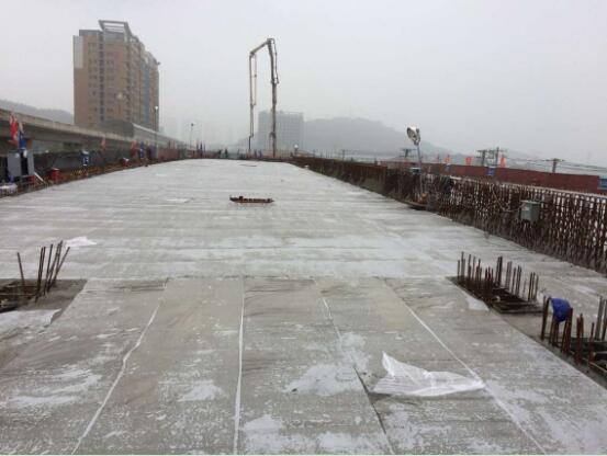 10月2日凌晨5时,伴随着噼里啪啦的鞭炮声,墨水湖北路(孟家铺立交—龙阳大道)工程汉阳大道孟家铺段第二联预应力箱梁浇筑施工正式开始。为确保此次箱梁浇筑顺利进行,该项目部特地安排2辆泵车及10台混凝土罐车循环作业,施工现场共计30余人同时施工。经过连续31个小时的紧张作业,最终该联长87米、宽26米、混凝土浇筑总量约为1750m3的箱梁,于10月3日中午12时成功浇筑完毕。