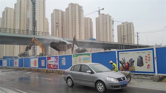 早在5月25日,汉阳区建设局相关领导便组织长江日报社记者到百威路现场了解工程建设情况,并在27日的长江日报上发布了百威路桥梁拆除新建公告。随后项目部积极配合交管部门完成了交通导流、路面清洗、交通信号灯安装以及交通指示牌制作安装工作,于6月5日开始,在车流量较小的时段,着手进行现状桥梁拆除。拆除过程中,在确保桥梁板缝切割时桥下车辆通行安全的同时,项目部还调度洒水车配合拆除机械进行拆除过程中洒水降尘工作,降低了现场施工给周边环境带来的影响,于27日完成了现状桥梁的全部拆除工作。截至日前,项目部正全力推进桥梁西侧的桩基施工,已完成各类桩基15根,而桥梁东侧受汛期影响,暂时无法进行桩基施工。