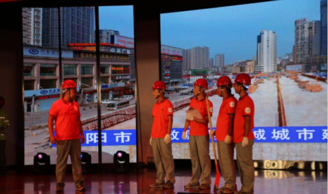 该情景剧由发生在天创市政李程身上的真实故事改编而成,讲述了李程在担任宝丰路硚口路(建设大道-京汉大道)改造工程项目经理期间,为抢抓工期,将家搬到项目部的感人事迹。舞台上,来自天创市政的14名员工,通过舞蹈、表演、音乐等艺术形式,配合现场舞美与恢弘的背景视频,将李程与妻子相恋结婚、项目团队冒雨防汛、李程携手妻子与市政兄弟共建大武汉等情景演绎得淋漓尽致,完美展现了天创市政“铁军”在市政建设中奋勇担当与无私奉献的精神。