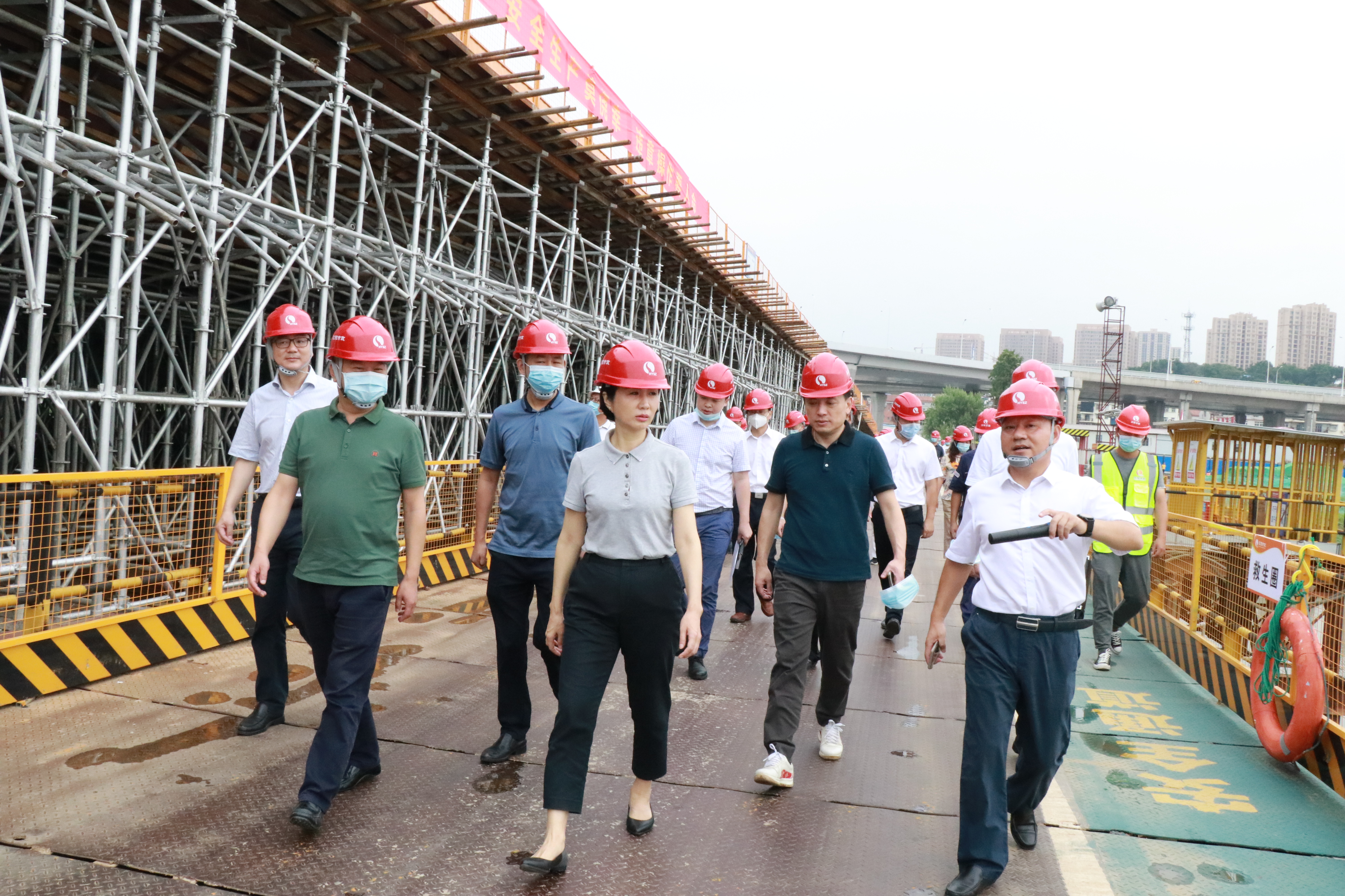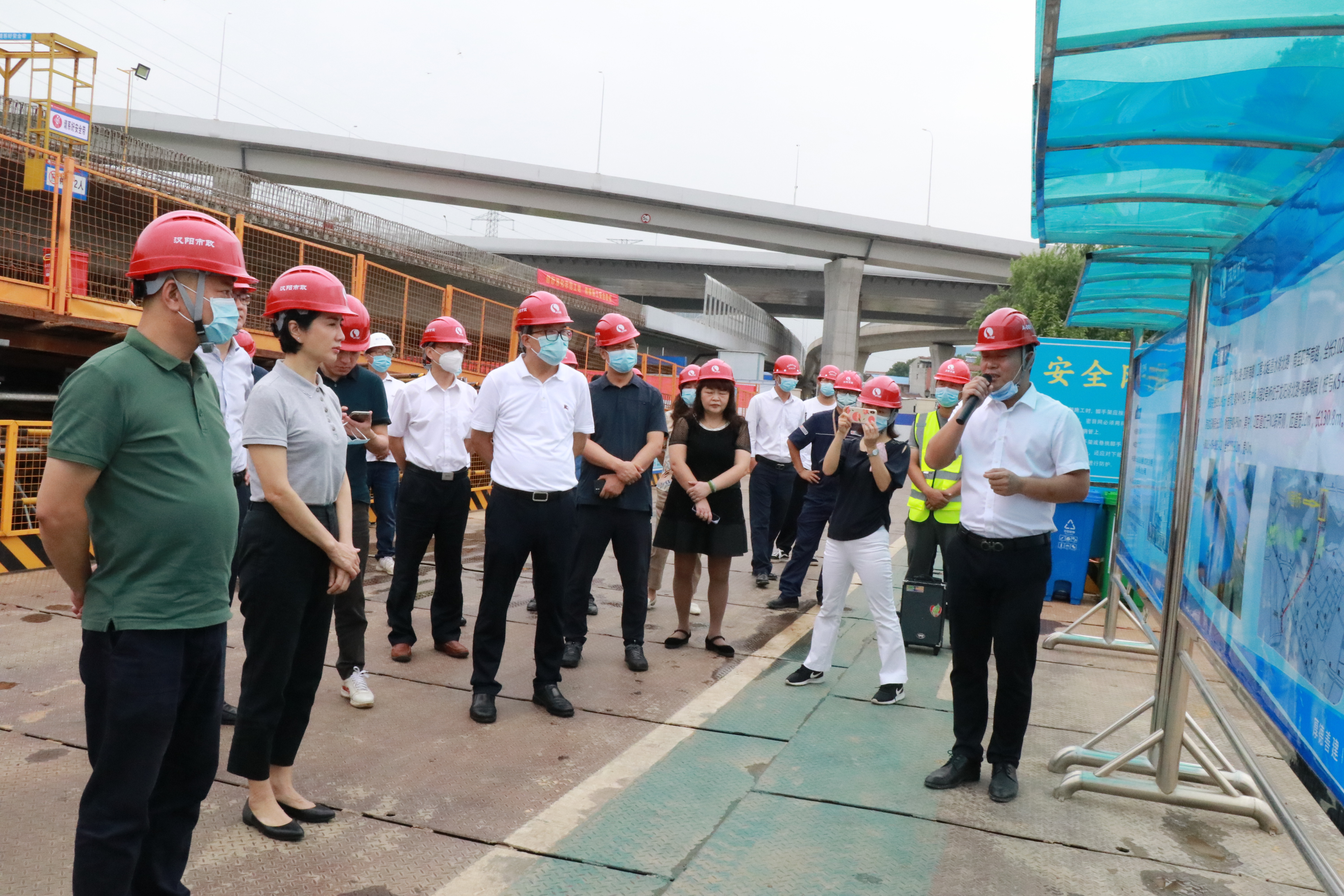 7月14日上午,汉阳区委书记、区长徐丽,副区长蔡松,区建设局局长胡红胜及区城管局,区环保局,区建管站等单位主要负责人一行前往仙女山路项目现场,就工地扬尘治理及文明施工工作展开调研。汉阳市政集团公司总经理虞志鹏,总工程师荆武,二公司党支部书记、董事长曹元鑫,支部副书记肖三秀,副总经理罗明飞陪同。