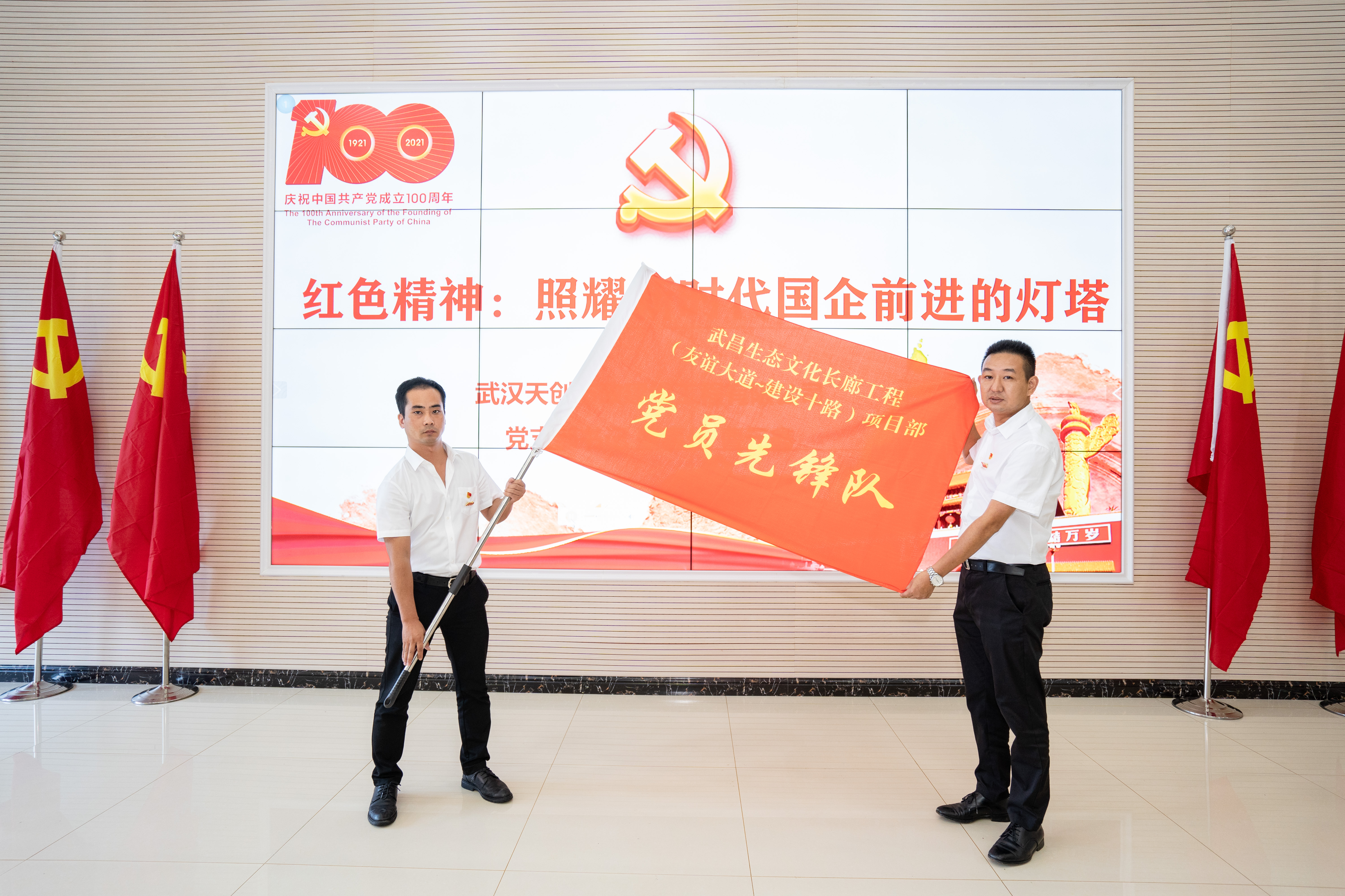 在“百年党史·红色传承”的主题党课开讲之前,党员齐唱国歌,8名同志被授予公司2021年优秀共产党员称号,武昌生态文化长廊工程(友谊大道-建设十路)项目部被授旗“党员先锋队”。