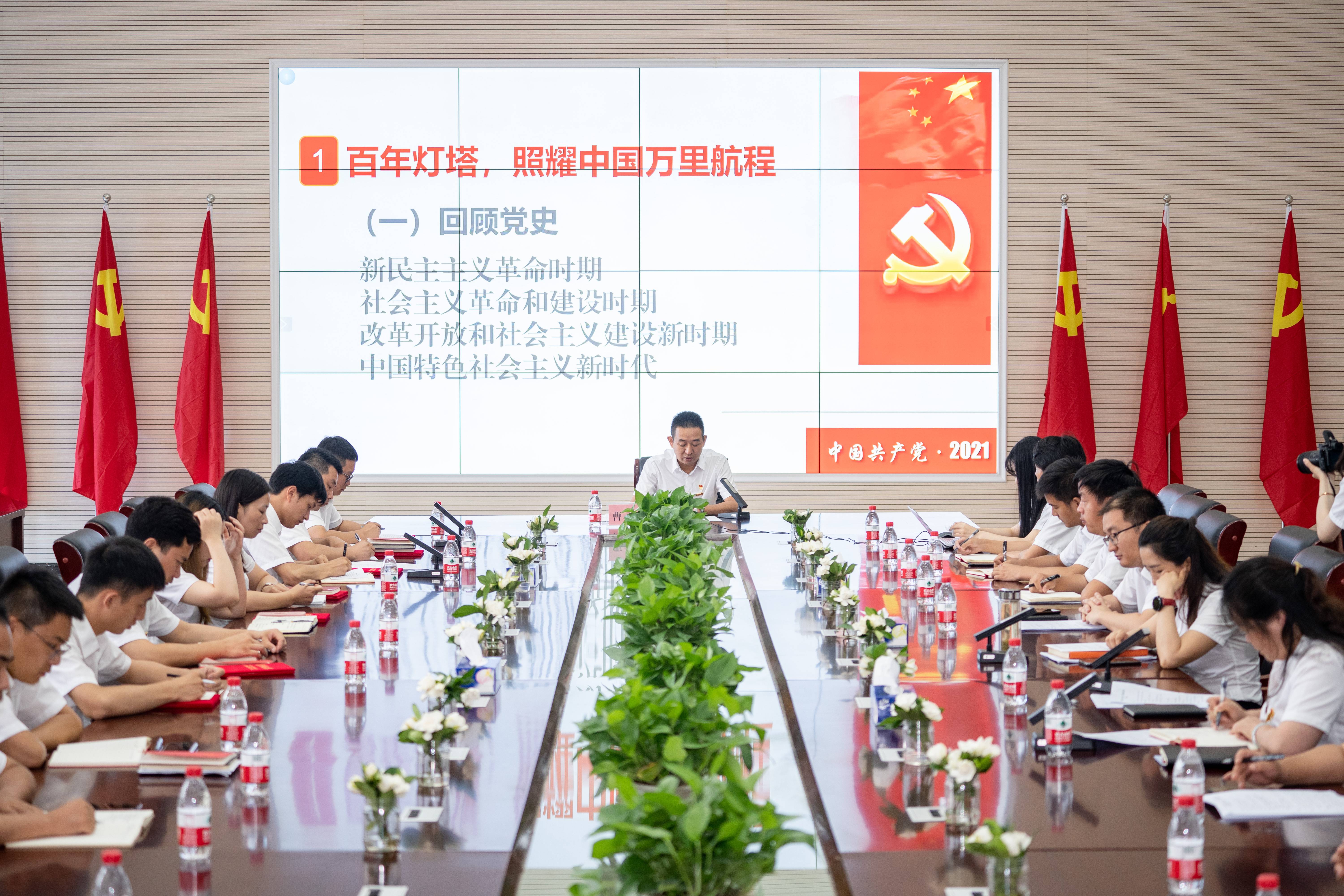 天创市政党支部书记、董事长曹元鑫同志带领全体党员重温入党誓词,并为党员们讲授主题党课《红色精神—照耀新时代国企前进的灯塔》。
