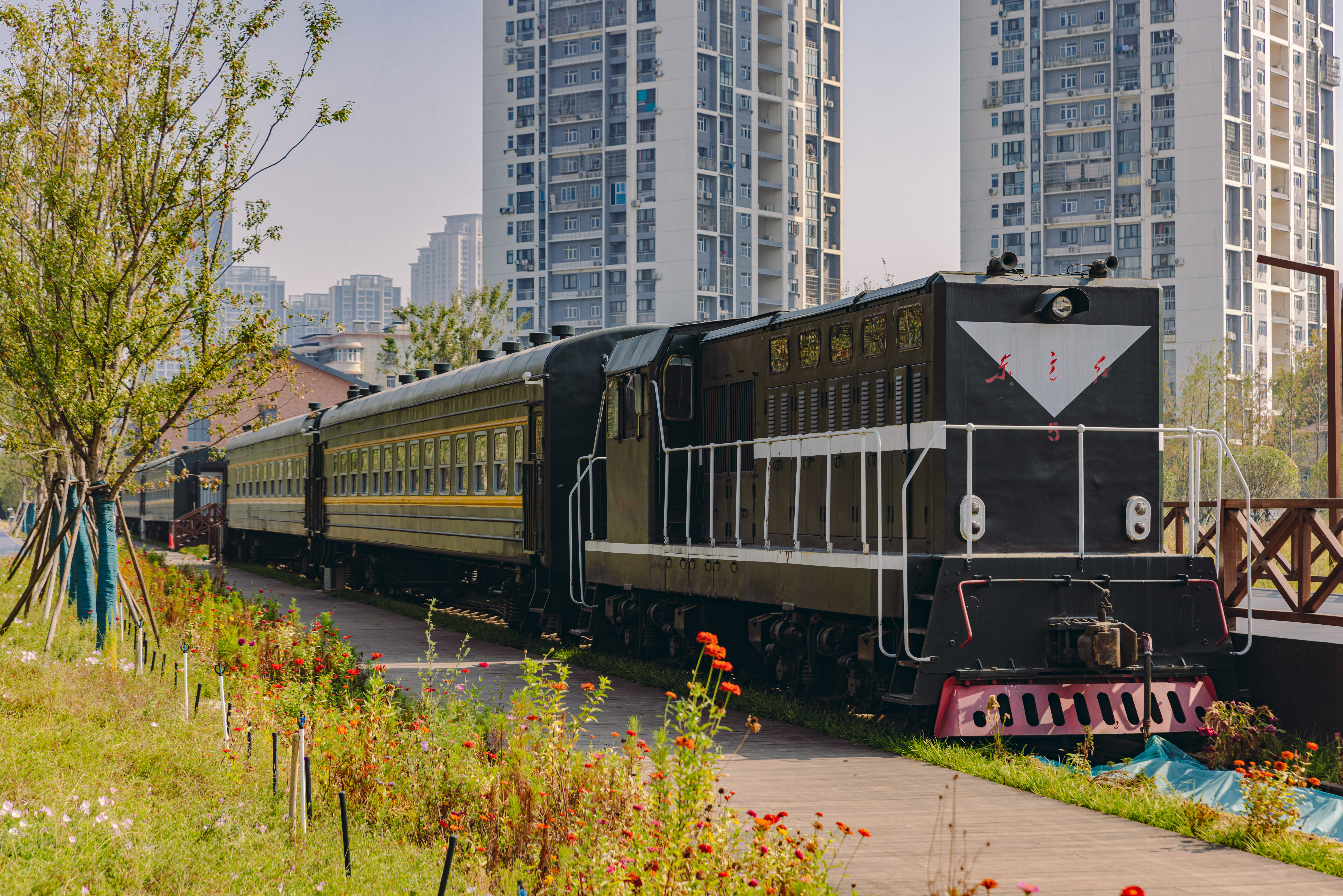 项目在建设过程中,积极搭建“事前+事中+事后”三位一体质量安全管理链条,将精细化施工理念落实到各个环节中。寻源老武九铁路机段老旧车头及车厢,翻旧为新,改造为火车餐厅,激活其潜藏文化价值;多次开展QC小组活动,废弃铁轨变身景观廊架,打造长江右岸城市功能新文化绿廊;广场铺装精选斧剁面芝麻黑、烧面芝麻灰、菠萝面芝麻黑三种花岗岩石材,