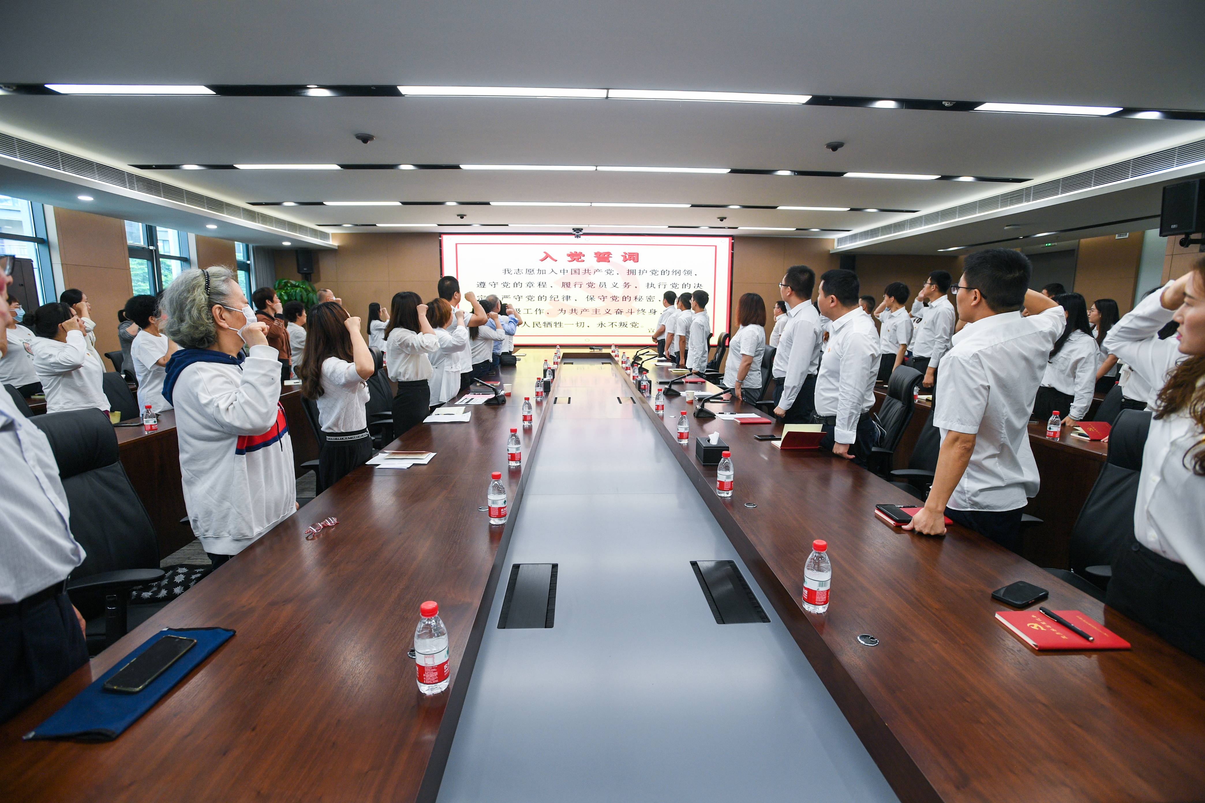 “我志愿加入中国共产党......”,全体党员在天创建设党委副书记、工会主席肖三秀的带领下重温入党誓词,铿锵有力的誓言,传达出每一名党员初心不改、砥砺前行的决心。
